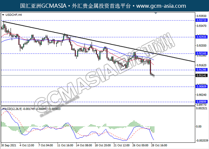 USDCHF,H4:美瑞突破前期支撑,空头排列。MACD动能略减,短期继续看空为主主。上方关注0.9140压力和0.9215压力,下方关注0.9060支撑和0.8990支撑。