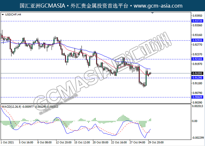 20211101 USDCHF-午间 by willy | Nov 1, 2021 | 美元兑瑞士法郎 | 0 comments USDCHF,H4:美瑞突破前期压力,多头排列。MACD形成金叉,动能略增,短期继续看多为主。上方关注0.9215压力和0.9295压力,下方关注0.9140支撑和0.9060支撑。