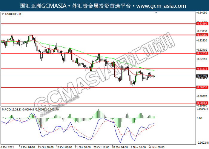 20211105 USDCHF by willy | Nov 5, 2021 | 美元兑瑞士法郎 | 0 comments USDCHF,H4: 美瑞震荡上行,目前测试前期压力。MACD多头动能略增,若突破可关注多头为主。上方关注0.9155压力和0.9225压力,下方关注0.9075支撑和0.9005支撑。
