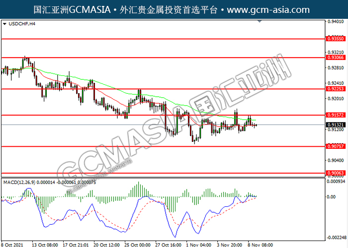 20211109 USDCHF by willy | Nov 9, 2021 | 美元兑瑞士法郎 | 0 comments USDCHF,H4: 美瑞高位回落。MACD多头动能略减,短期可关注空头为主。上方关注0.9155压力和0.9225压力,下方关注0.9075支撑和0.9005支撑。
