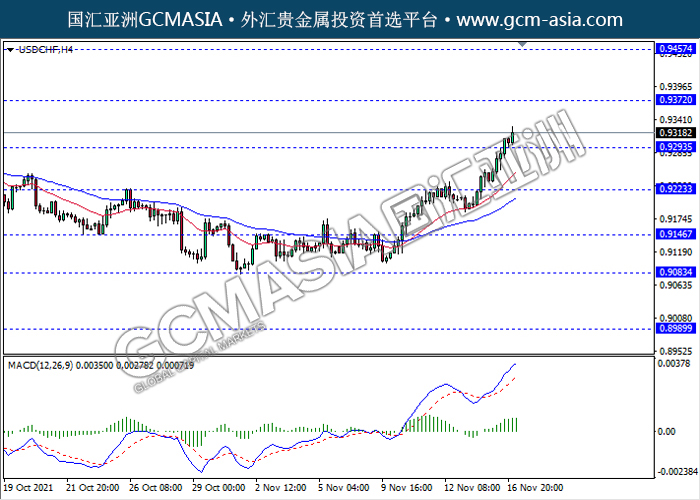 20211117 USDCHF-午间 by willy | Nov 17, 2021 | 美元兑瑞士法郎 | 0 comments USDCHF,H4: 美瑞突破前期压力,多头排列。MACD动能持续略增,中期继续看多为主。上方关注0.9370压力和0.9455压力,下方关注0.9295支撑和0.9225支撑。