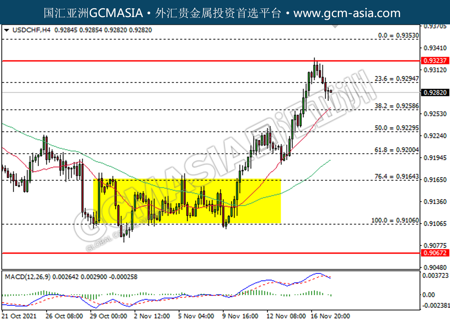 20211118 USDCHF by willy | Nov 18, 2021 | 美元兑瑞士法郎 | 0 comments USDCHF,H4:美瑞高位承压回落。MACD已形成死叉,动能偏弱,短期关注空头势力为主。上方关注0.9295压力和0.9325压力,下方关注0.9260支撑和0.9230支撑。