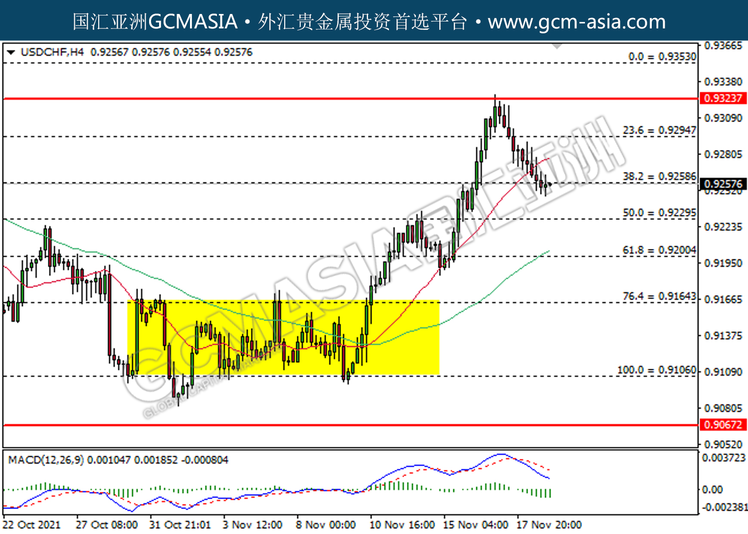 USDCHF,H4:美瑞高位承压回落。MACD已形成死叉,动能偏弱,若下破可关注空头势力为主。上方关注0.9295压力和0.9325压力,下方关注0.9260支撑和0.9230支撑。