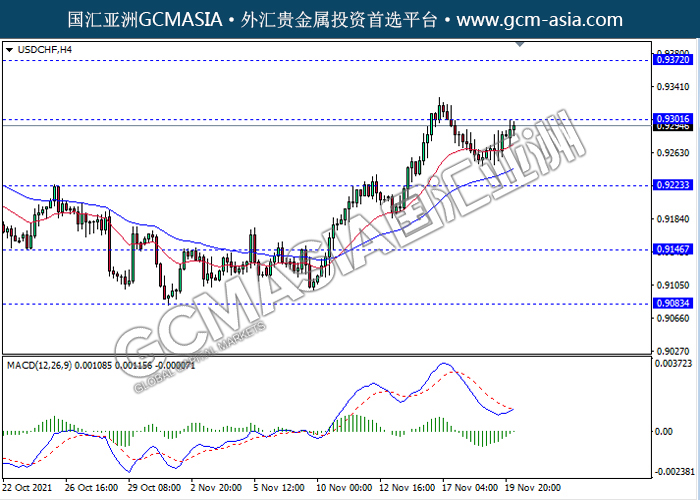 USDCHF,H4: 美瑞震荡上行,目前测试前期压力。MACD形成金叉,动能略增,若突破可继续看多为主。上方关注0.9300压力和0.9370压力,下方关注0.9225支撑和0.9145支撑。