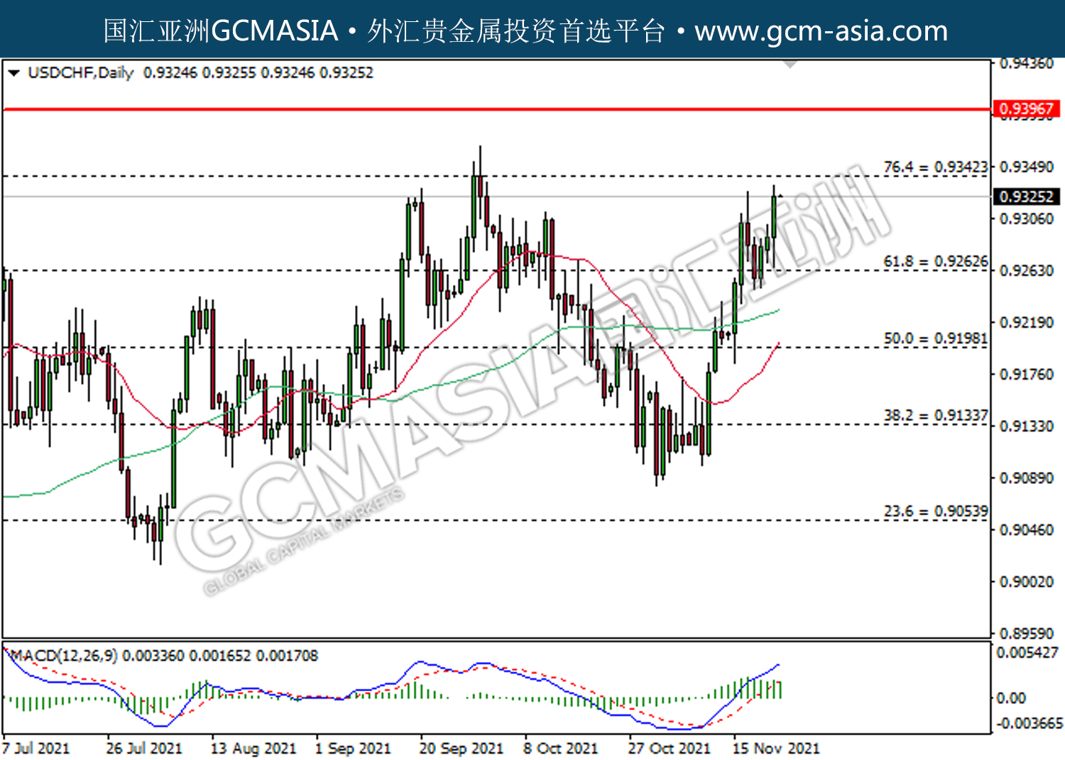20211123 USDCHF by willy | Nov 23, 2021 | 美元兑瑞士法郎 | 0 comments USDCHF,Daily:美瑞低位反弹。MACD已形成金叉,动能偏强,中期关注多头势力为主。上方关注0.9240压力和0.9395压力,下方关注0.9260支撑和0.9200支撑。