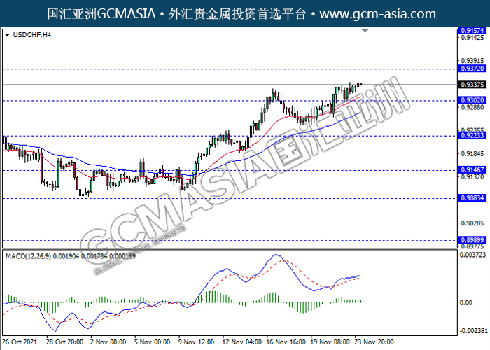 USDCHF,H4: 美瑞触底反弹为主。MACD动能略增,短期继续看多为主。上方关注0.9370压力和0.9455压力,下方关注0.9300支撑和0.9225支撑。