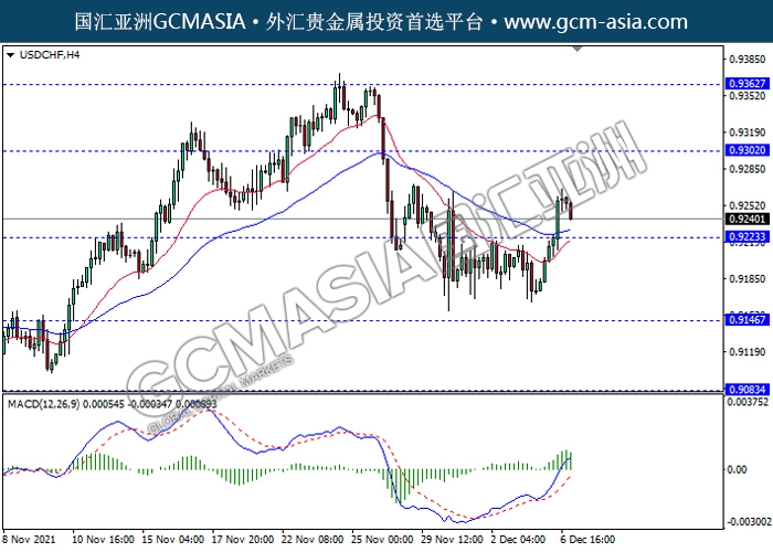 20211207 USDCHF-午间 by keyk | Dec 7, 2021 | 美元兑瑞士法郎 | 0 comments USDCHF,H4: 美瑞高位承压回落。MACD多头动能略减,短期可继续关注空头回调为主。上方关注0.9300压力和0.9360压力,下方关注0.9225支撑和0.9145支撑。