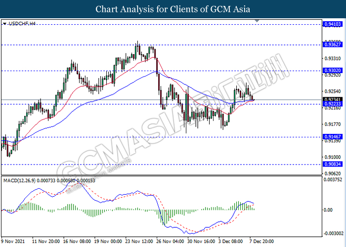 20211208 USDCHF-午间 by keyk | Dec 8, 2021 | 美元兑瑞士法郎 | 0 comments USDCHF,H4: 美瑞高位承压回落,目前测试前期支撑。MACD多头动能略减,若突破可继续看空为主。上方关注0.9300压力和0.9360压力,下方关注0.9225支撑和0.9145支撑。