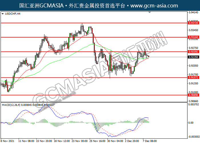 20211208 USDCHF by willy | Dec 8, 2021 | 美元兑瑞士法郎 | 0 comments USDCHF,H4: 美瑞震荡上行,目前测试前期压力。然而,MACD多头动能略减,短期可关注技术性回调为主。上方关注0.9260压力和0.9315压力,下方关注0.9155支撑和0.9090支撑。