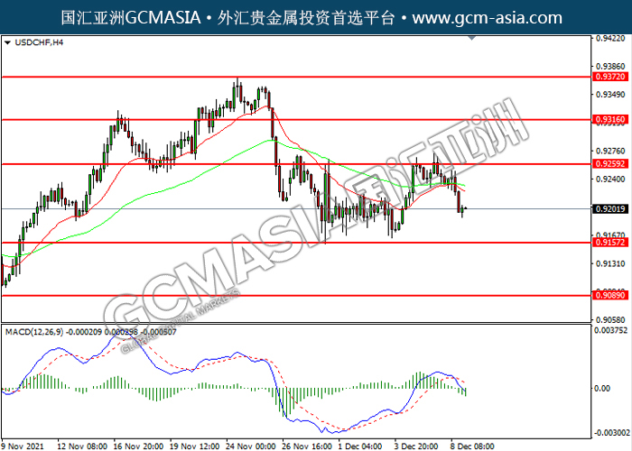 20211209 USDCHF by willy | Dec 9, 2021 | 美元兑瑞士法郎 | 0 comments USDCHF,H4: 美瑞高位回落。MACD空头动能略增,短期可关注空头为主。上方关注0.9260压力和0.9315压力,下方关注0.9155支撑和0.9090支撑。