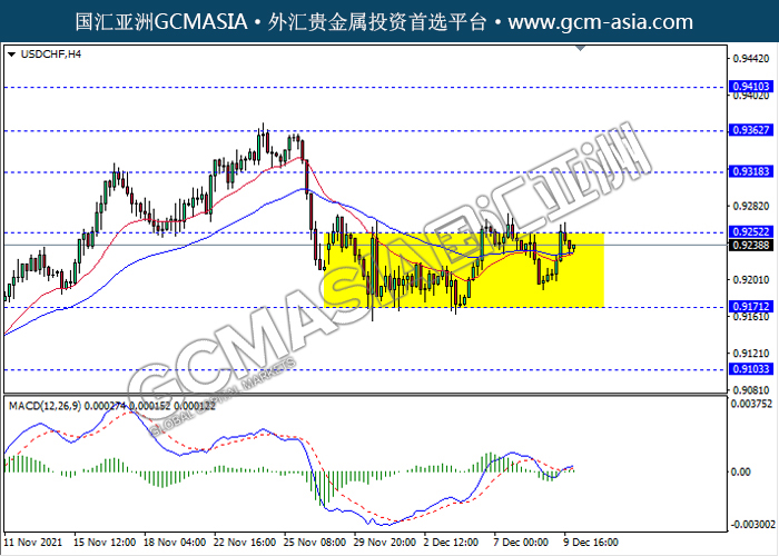 20211210 USDCHF-午间 by keyk | Dec 10, 2021 | 美元兑瑞士法郎 | 0 comments USDCHF,H4: 美瑞区间震荡盘整,目前测试靠近前期压力。然而,MACD形成金叉,动能略增,若突破关注多头方向为主。上方关注0.9250压力和0.9320压力,下方关注0.9170支撑和0.9105支撑。