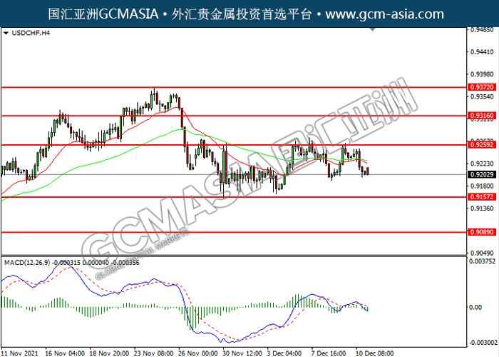 20211213 USDCHF by willy | Dec 12, 2021 | 美元兑瑞士法郎 | 0 comments USDCHF,H4: 美瑞高位回落。MACD空头动能略增,短期可关注空头为主。上方关注0.9260压力和0.9315压力,下方关注0.9155支撑和0.9090支撑。