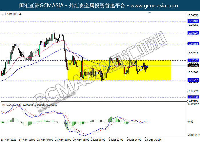 20211214 USDCHF-午间 by keyk | Dec 14, 2021 | 美元兑瑞士法郎 | 0 comments USDCHF,H4: 美瑞仍区间震荡交易。MACD缺乏动能和清晰方向,建议等更明确信号出现才进入市场。上方关注0.9250压力和0.9320压力,下方关注0.9170支撑和0.9105支撑。
