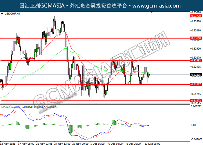 20211214 USDCHF by willy | Dec 14, 2021 | 美元兑瑞士法郎 | 0 comments USDCHF,H4: 美瑞高位回落。MACD空头动能略增,短期可关注空头为主。上方关注0.9260压力和0.9315压力,下方关注0.9200支撑和0.9155支撑。