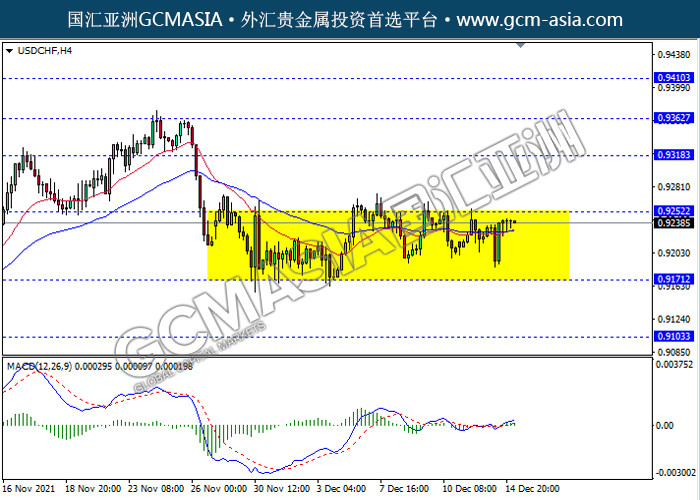 20211215 USDCHF-午间 by keyk | Dec 15, 2021 | 美元兑瑞士法郎 | 0 comments USDCHF,H4: 美瑞震荡盘整,目前测试靠近前期压力。然而,MACD显示多头信号,动能略增,若突破可继续看为主。上方关注0.9250压力和0.9320压力,下方关注0.9170支撑和0.9105支撑。