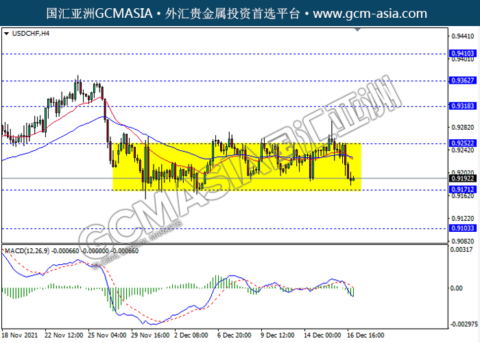 USDCHF,H4: 美瑞仍区震荡盘整,目前测试靠近前期支撑。然而,MACD动能略减,若突破可关注空头方向为主。上方关注0.9250压力和0.9320压力,下方关注0.9170支撑和0.9105支撑。