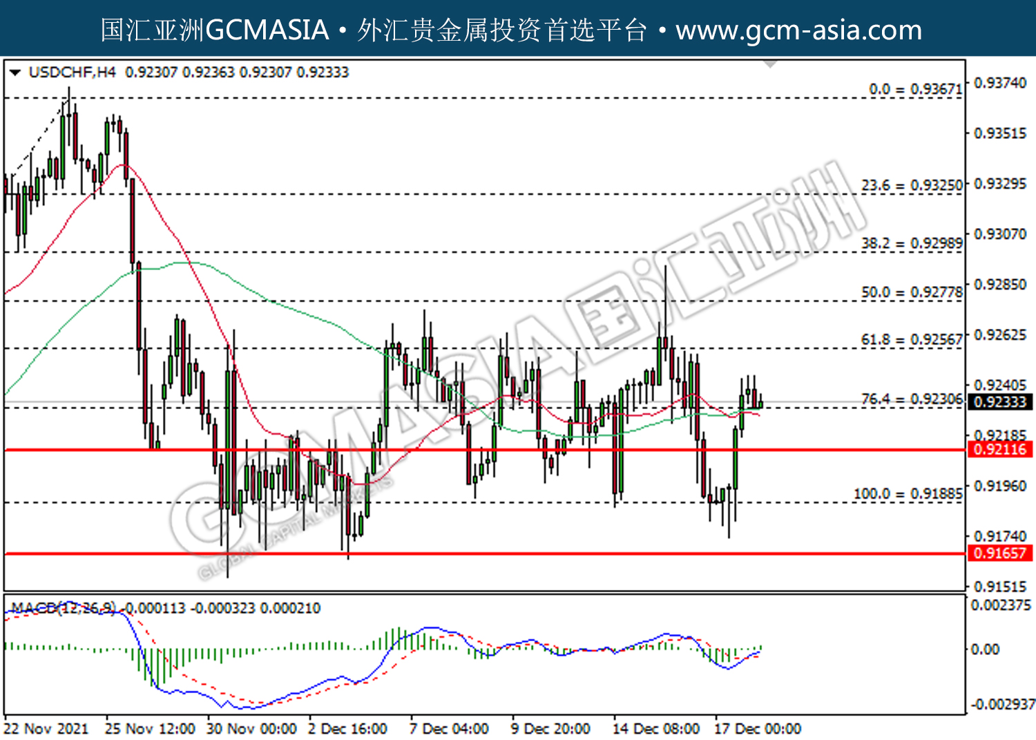 20211220 USDCHF by willy | Dec 20, 2021 | 美元兑瑞士法郎 | 0 comments USDCHF,H4:美瑞低位反弹。MACD已形成金叉,动能偏强,短期关注多头势力。上方关注0.9255压力和0.9280压力,下方关注0.9230支撑和0.9210支撑。