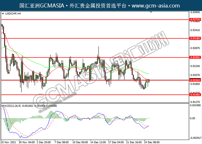 USDCHF,H4: 美瑞震荡下行,目前测试前期支撑。然而,MACD多头动能略增,短期可关注技术性回调为主。上方关注0.9260压力和0.9315压力,下方关注0.9190支撑和0.9150支撑。