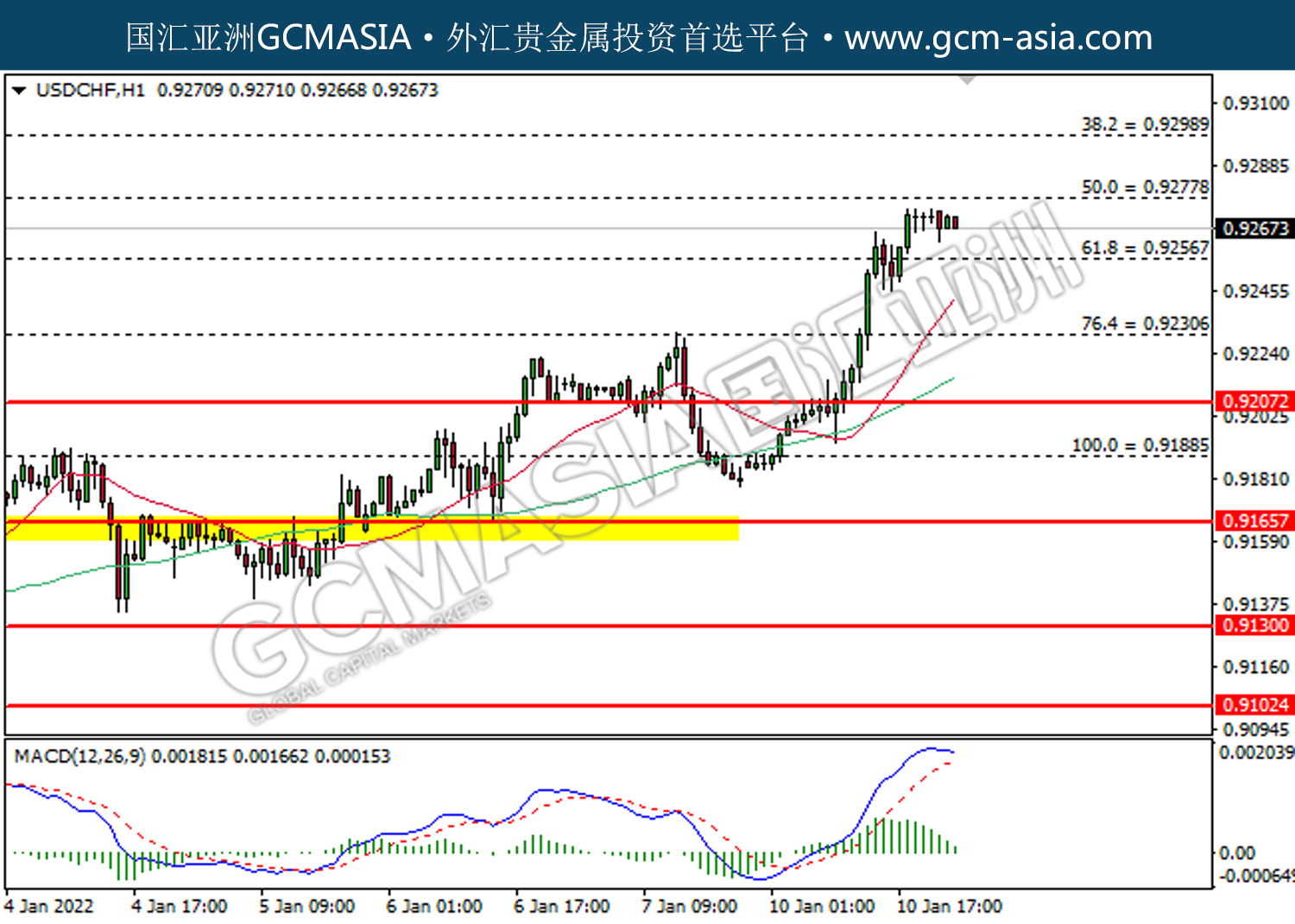 20220111 USDCHF by willy | Jan 11, 2022 | 美元兑瑞士法郎 | 0 comments USDCHF,H1:美瑞受承压回落。MACD多头动能有所略减,短期关注空头势力。上方关注0.9280压力和0.9300压力,下方关注0.9255支撑和0.9230支撑。