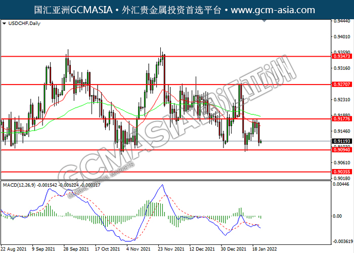 20220124 USDCHF by willy | Jan 24, 2022 | 美元兑瑞士法郎 | 0 comments USDCHF,Daily: 美瑞高位回落,目前靠近前期支撑。MACD空头动能略增,若突破可关注空头为主。上方关注0.9180压力和0.9270压力,下方关注0.9095支撑和0.9035支撑。