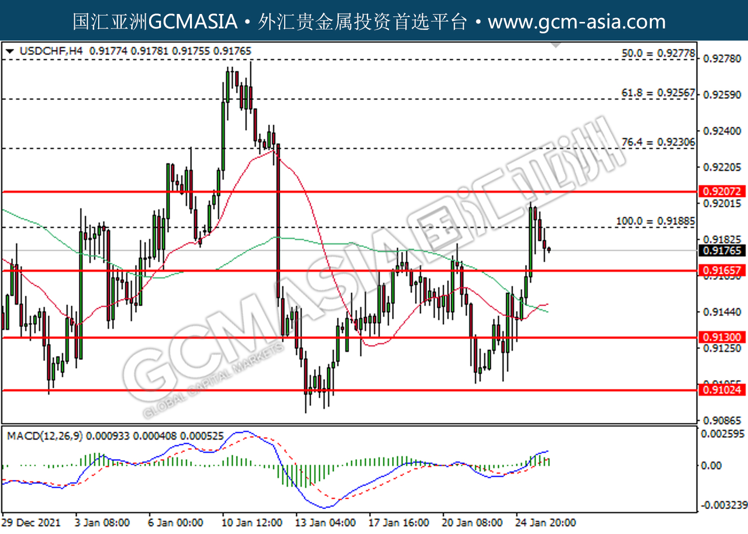 20220126 USDCHF by willy | Jan 26, 2022 | 美元兑瑞士法郎 | 0 comments USDCHF,H4:美瑞高位承压回落。MACD多头动能有所略减,短期关注空头势力。上方关注0.9190压力和0.9210压力,下方关注0.9165支撑和0.9130支撑。