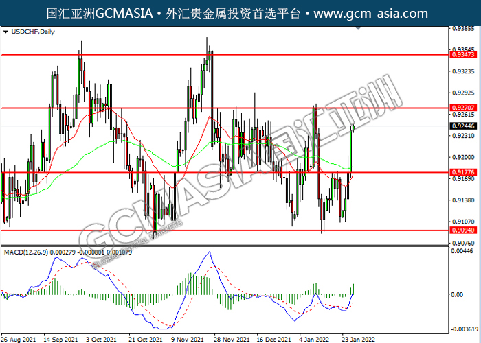 20220127 USDCHF-午间 by willy | Jan 27, 2022 | 美元兑瑞士法郎 | 0 comments USDCHF,Daily: 美瑞低位反弹,目前靠近前期压力。MACD多头动能略增,若突破可关注多头为主。上方关注0.9270压力和0.9345压力,下方关注0.9180支撑和0.9095支撑。