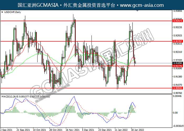 USDCHF,Daily: 美瑞高位回落,目前测试前期支撑。MACD多头动能略减,若下破可关注空头为主。上方关注0.9270压力和0.9345压力,下方关注0.9180支撑和0.9095支撑。