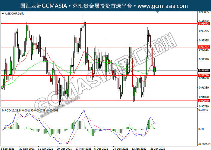 20220204 USDCHF-午间 by willy | Feb 4, 2022 | 美元兑瑞士法郎 | 0 comments USDCHF,Daily: 美瑞高位回落,目前测试前期支撑。MACD多头动能略减,若下破可关注空头为主。上方关注0.9270压力和0.9345压力,下方关注0.9180支撑和0.9095支撑。