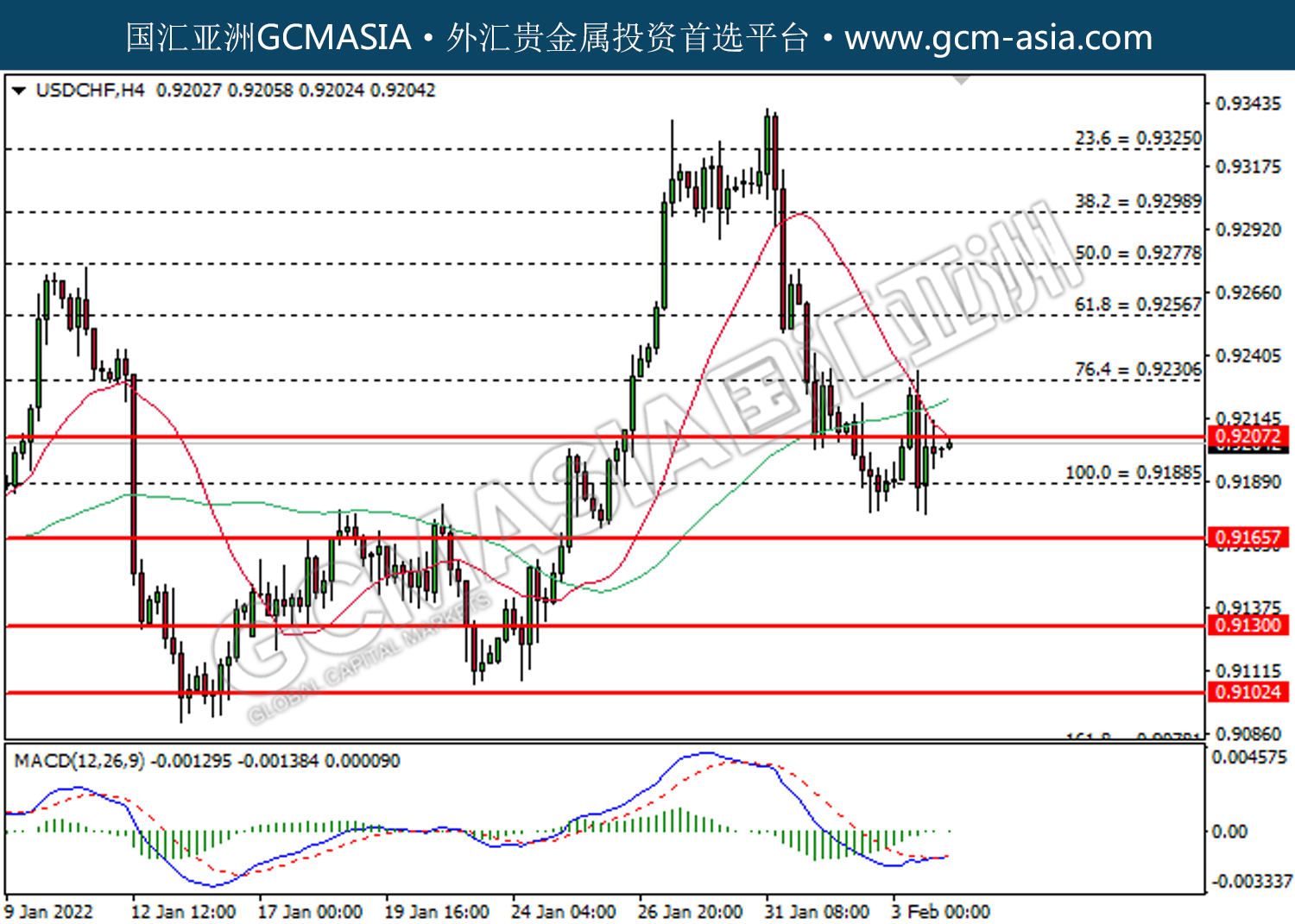 20220204 USDCHF by willy | Feb 4, 2022 | 美元兑瑞士法郎 | 0 comments USDCHF,H4:美瑞低位反弹。MACD空头动能有所略减,短期关注多头势力。上方关注0.9210压力和0.9230压力,下方关注0.9190支撑和0.9165支撑。