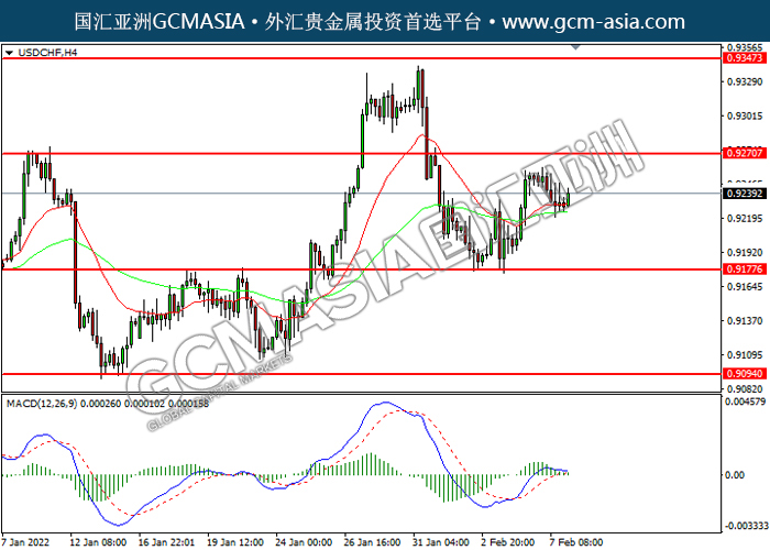 20220208 USDCHF-午间 by willy | Feb 8, 2022 | 美元兑瑞士法郎 | 0 comments USDCHF,H4: 美瑞震荡上行,目前测试前期压力。MACD多头动能略减增,短期可关注多头为主。上方关注0.9270压力和0.9345压力,下方关注0.9180支撑和0.9095支撑。