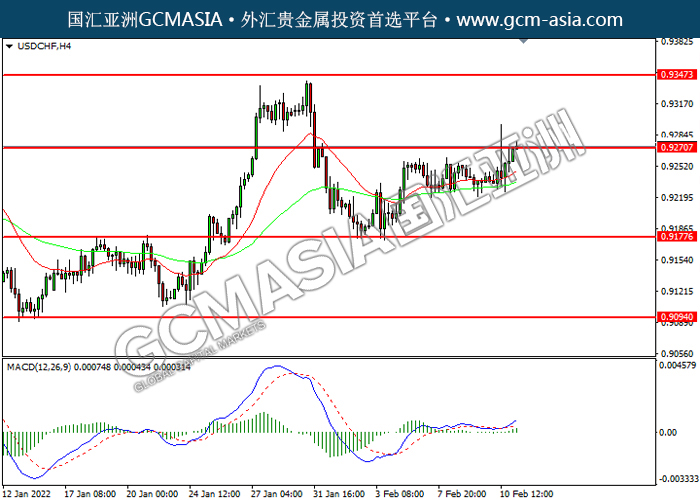 USDCHF,H4: 美瑞震荡上行,目前测试前期压力。MACD多头动能略增,短期可关注多头为主。上方关注0.9270压力和0.9345压力,下方关注0.9180支撑和0.9095支撑。