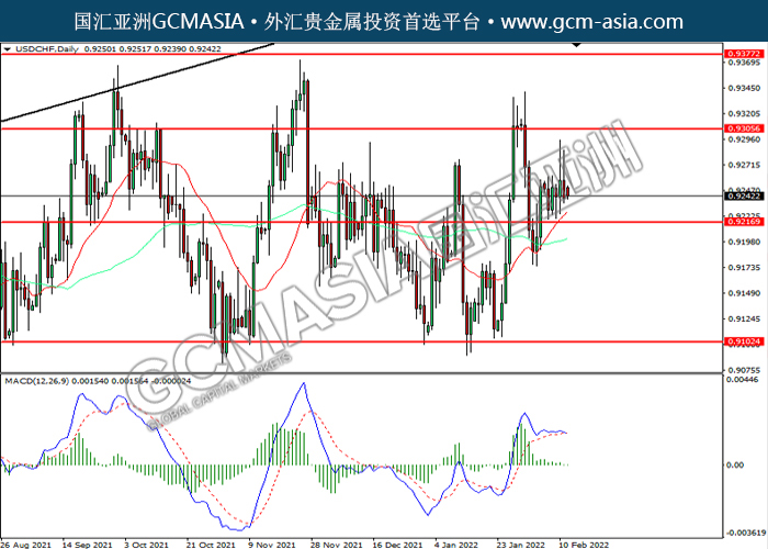 20220214 USDCHF by willy | Feb 14, 2022 | 美元兑瑞士法郎 | 0 comments USDCHF,Daily:美瑞高位回落,目前测试前期支撑。MACD多头动能略减,短期可继续看空。上方关注0.9305压力和0.9375压力,下方关注0.9215支撑和0.9100支撑。