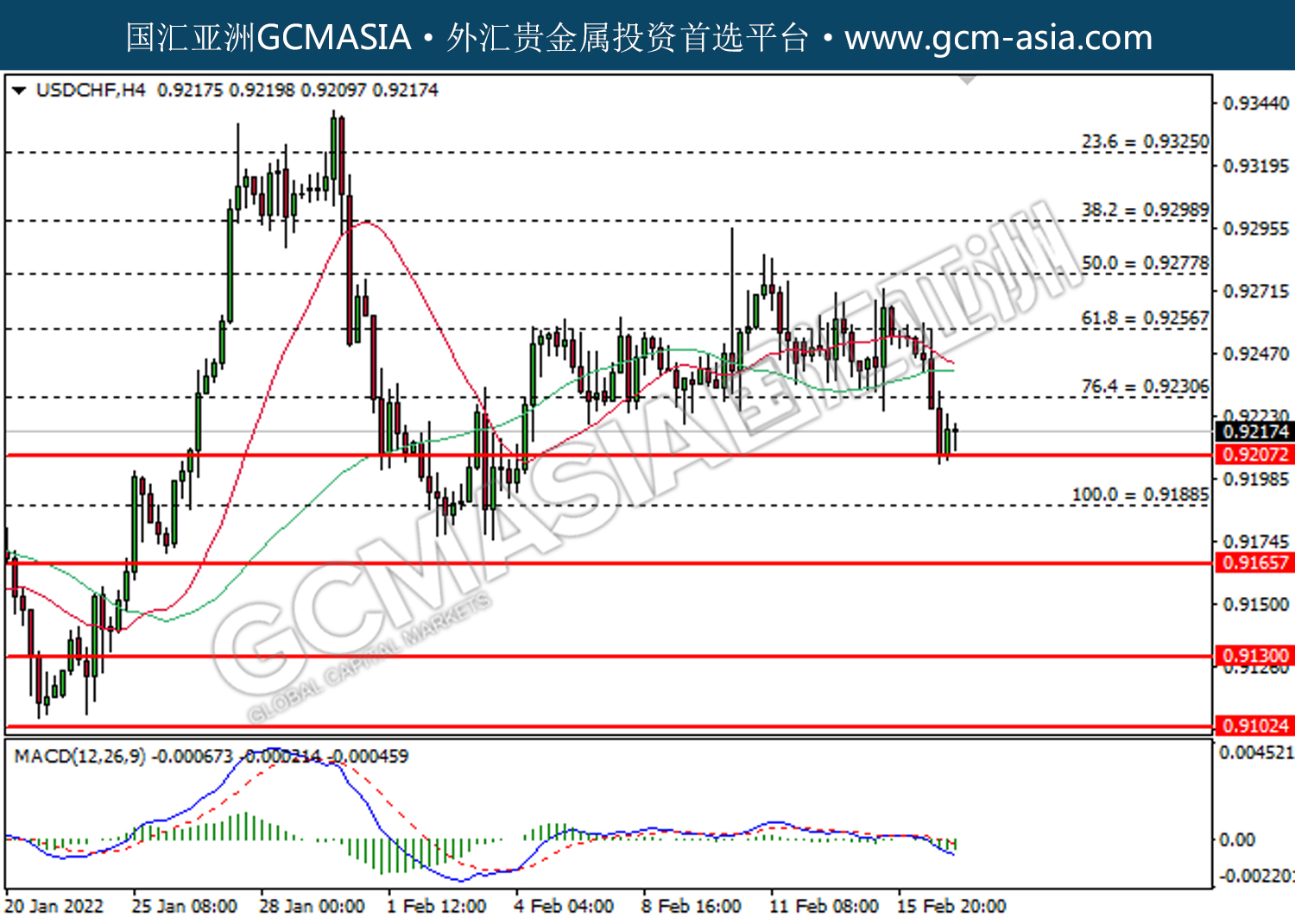 20220217 USDCHF-Noon by willy | Feb 17, 2022 | 美元兑瑞士法郎 | 0 comments USDCHF,H4:美瑞受承压回落。MACD已形成死叉,动能转弱,短期关注空头势力。上方关注0.9230压力和0.9255压力,下方关注0.9210支撑和0.9190支撑。