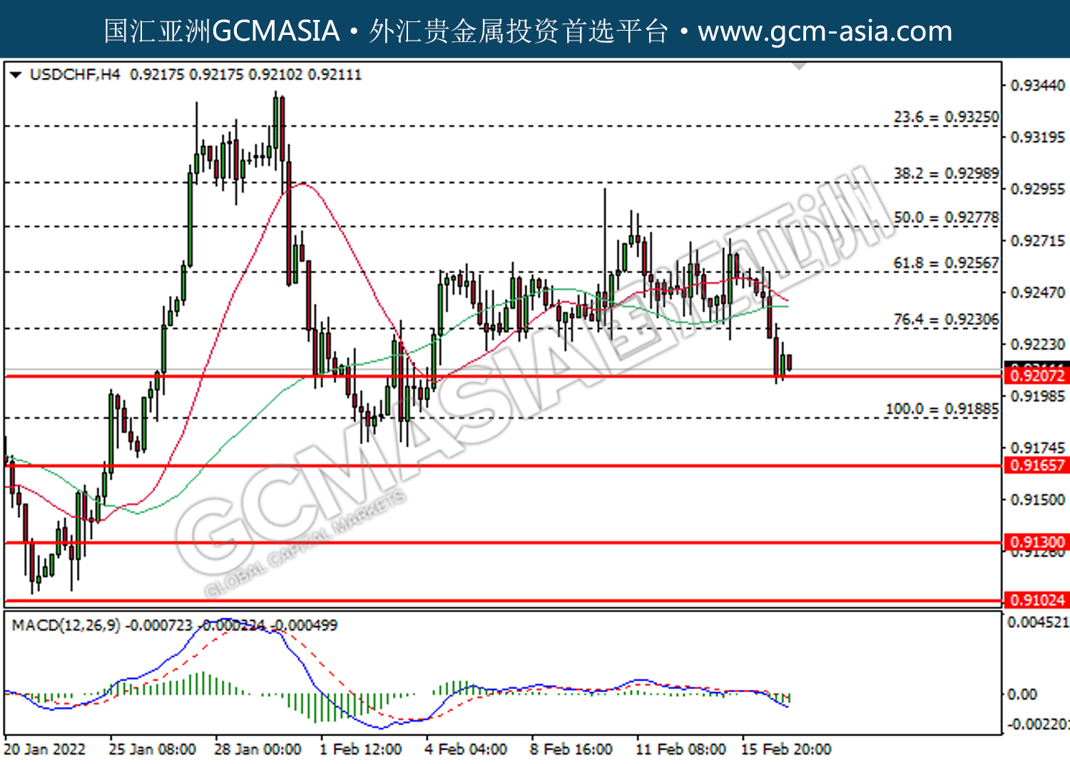 20220217 USDCHF by willy | Feb 17, 2022 | 美元兑瑞士法郎 | 0 comments USDCHF,H4:美瑞受承压回落。MACD已形成死叉,动能转弱,短期关注空头势力。上方关注0.9230压力和0.9255压力,下方关注0.9210支撑和0.9190支撑。