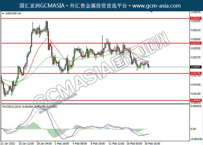 20220221 USDCHF-午间 by willy | Feb 21, 2022 | 美元兑瑞士法郎 | 0 comments USDCHF,H4: 美瑞震荡下行,目前测试前期支撑。MACD空头动能略增,若下破可关注空头为主。上方关注0.9270压力和0.9345压力,下方关注0.9180支撑和0.9095支撑。