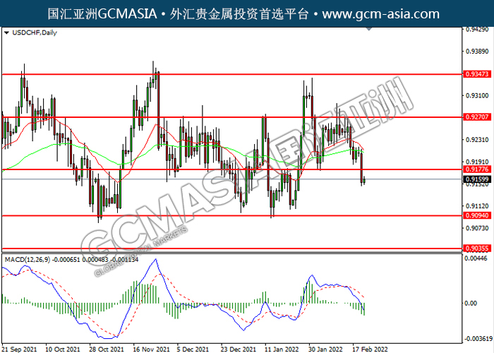 20220222 USDCHF-午间 by willy | Feb 22, 2022 | 美元兑瑞士法郎 | 0 comments USDCHF,Daily: 美瑞下破前期支撑,持续下行。MACD空头动能略增,若下破可关注空头为主。上方关注0.9180压力和0.9270压力,下方关注0.9095支撑和0.9035支撑。