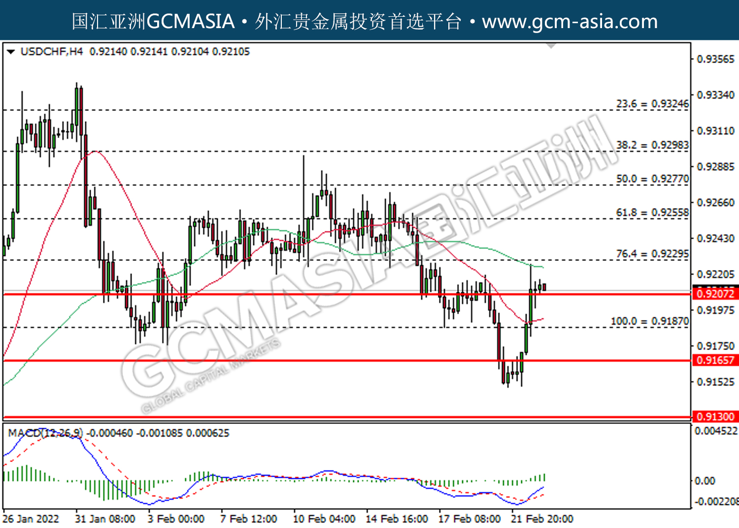 20220223 USDCHF by willy | Feb 23, 2022 | 美元兑瑞士法郎 | 0 comments USDCHF,H4:美瑞低位反弹。MACD已形成金叉,动能转强,短期关注多头势力。上方关注0.9225压力和0.9255压力,下方关注0.9210支撑和0.9190支撑。