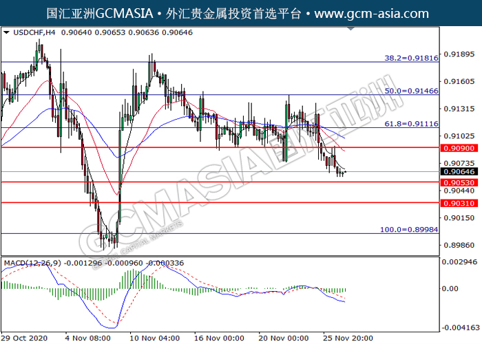 20201127 USDCHF by willy | Nov 27, 2020 | 美元兑瑞士法郎 | 0 comments GCMAsia-USDCHF USDCHF 2020-11-27 USDCHF,H4:美瑞突破后持续下行。MACD动能持续偏弱,短期可关注空头为主。上方关注0.9090压力和0.9110压力,下方关注0.9055支撑和0.9030支撑。