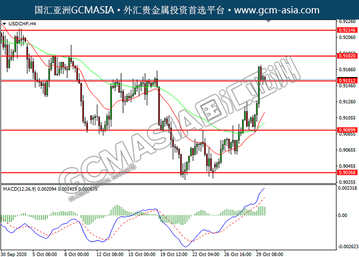 USDCHF,H4:美瑞高位回落,目前测试前期支撑。MACD多头动能略减,若下破可关注空头为主。上方关注0.9180压力和0.9215压力,下方关注0.9150支撑和0.9090支撑。