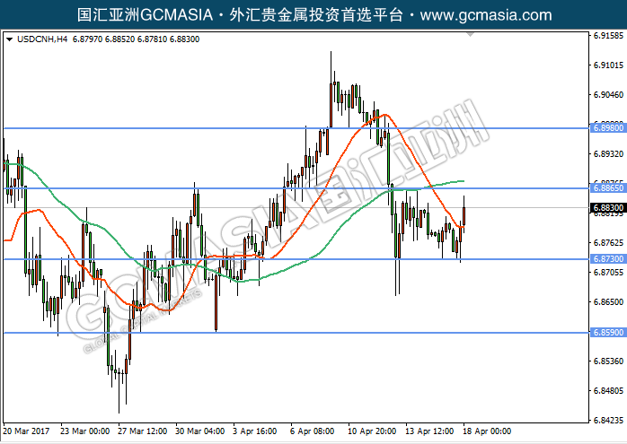 USDCNH H4:美元兑离岸人民币触顶回落,当前处于区间震荡,关注突破;均线趋缓,多空胶着,暂且观望。上方关注6.8865压力和6.8980压力,下方关注6.8730支撑和6.8590支撑。