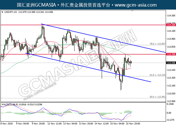 2018-11-16 USDJPY by wind | Nov 16, 2018 | 美元兑日元 | 0 comments GCM ASIA - USDJPY USDJPY 2018-11-16 USDJPY,H1:美日处于下行通道。MACD多头动能略减,短期可关注空头回调。上方关注113.70压力和113.85压力,下方关注113.30支撑和112.95支撑。