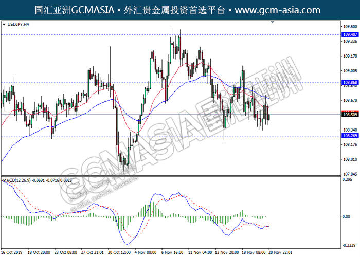 USDJPY, H4: 美日接触平均线后高位回落。MACD显示空头,动能略减,短期继续关注空头走势回落为主。上方关注108.85压力和109.40压力,下方关注108.25支撑和107.55支撑。