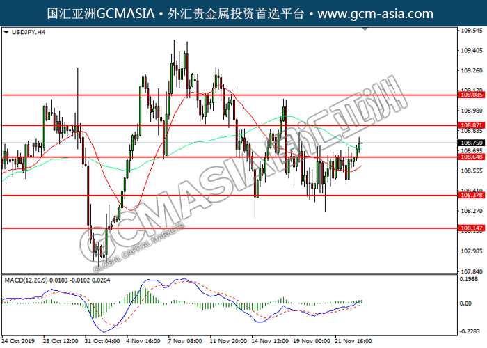20191125 USDJPY-午间 by keyk | Nov 25, 2019 | 美元兑日元 | 0 comments GCMAsia - USDJPY USDJPY 2019-11-25 USDJPY,H4:美日突破后持续上升。MACD多头动能略增,短期可关注多头为主。上方关注108.85压力和109.10压力,下方关注108.65支撑和108.40支撑。