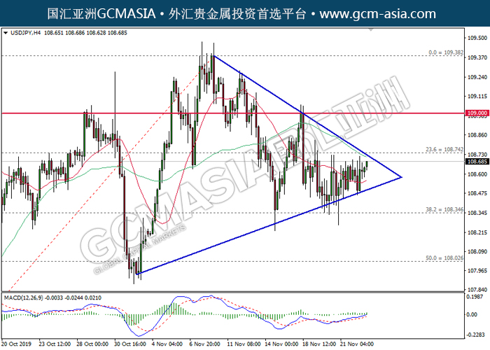USDJPY,H4:美日处于三角趋势。由于MACD和价格波动还没显示明确信号,建议等待突破后才进行交易。上方关注108.75压力和109.00压力,下方关注108.35支撑和108.00支撑。