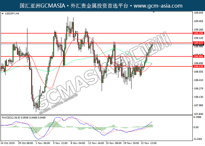 USDJPY,H4:美日多头排列,目前测试前期压力。MACD多头动能略增,若上破可关注多头为主。上方关注109.05压力和109.20压力,下方关注108.80支撑和108.65支撑。