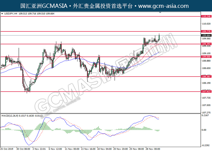 20191202 USDJPY-午间 by keyk | Dec 2, 2019 | 美元兑日元 | 0 comments GCMAsia - USDJPY USDJPY 2019-12-02 USDJPY, H4: 美日低位反弹。MACD转于多头,动能略增,短期可关注多头为主。上方关注109.80压力和110.25压力,下方关注109.40支撑和109.00支撑。