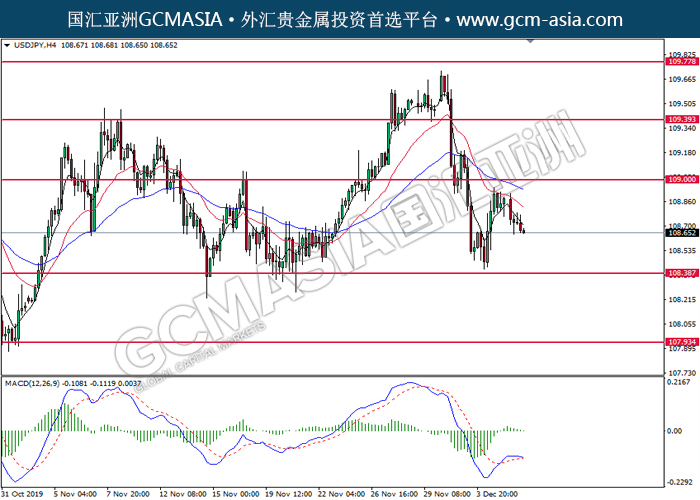USDJPY, H4: 美日高位承压后回落。MACD形成死叉,动能略减,短期可继续关注空头为主。上方关注109.00压力和109.40压力,下方关注108.40支撑和107.95支撑。