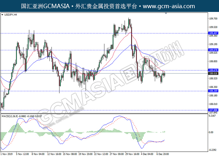 USDJPY, H4: 美日触底反弹,目前测试靠近前期压力。MACD形成金叉,动能略增,若突破关注多头走势为主。上方关注108.65压力和109.05压力,下方关注108.25支撑和107.90支撑。