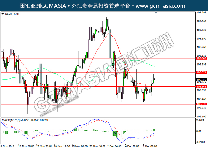 20191211 USDJPY by willy | Dec 11, 2019 | 美元兑日元 | 0 comments GCMAsia - USDJPY USDJPY 2019-12-11 USDJPY, H4: 美日震荡上行。MACD多头动能略增,短期可关注多头走势为主。上方关注108.85压力和109.10压力,下方关注108.65支撑和108.40支撑。