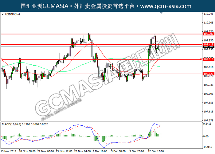 USDJPY, H4: 美日震荡上行,目前测试前期压力。然而,MACD多头动能略减,短期可关注技术性回调为主。上方关注109.40压力和109.70压力,下方关注109.00支撑和108.60支撑。